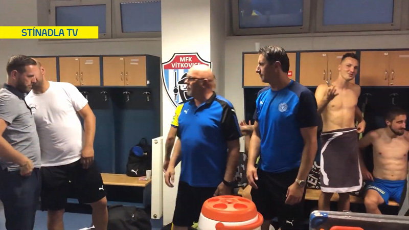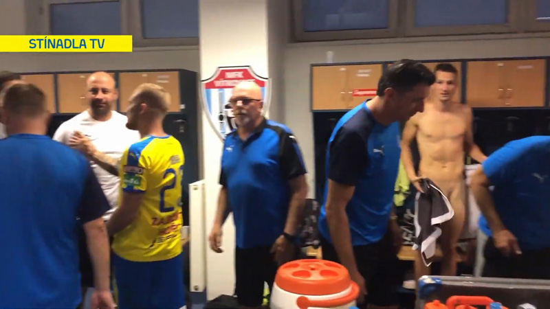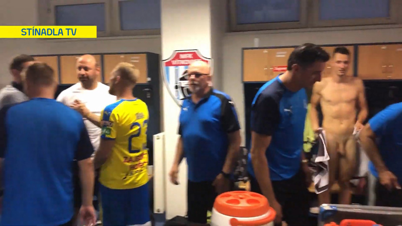 Michal Jerabek is a cute Czech footballer playing for FK Teplice. He has been caught showing in his long uncut cock while accidentally towelling off during a locker room interview.
