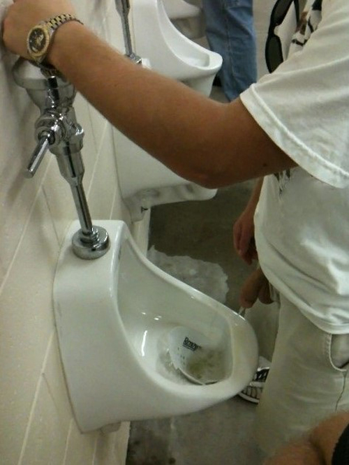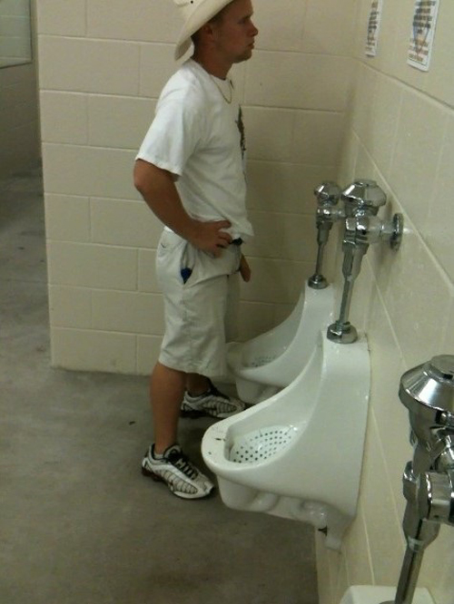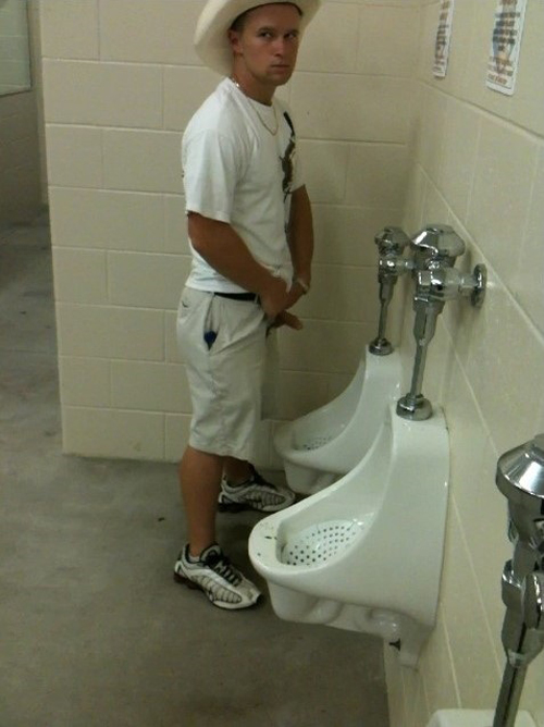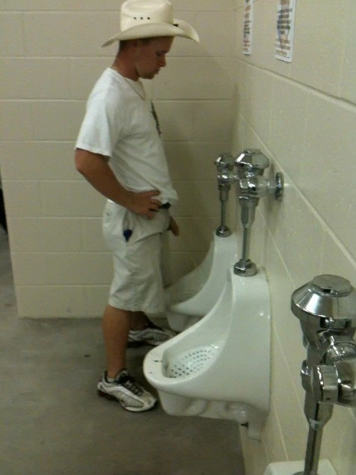 This sexy cowboy is truly hot: he has been caught while taking a piss at the stadium’s toilet urinals. He’s totally relaxed, hands on his hips, showing his nice cock. It seems he has been caught more than once!