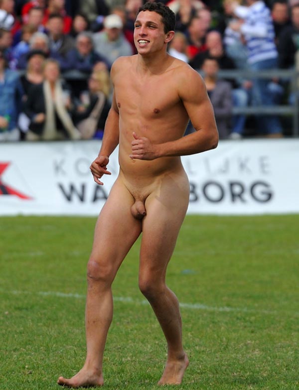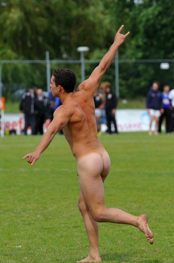 When I saw these pictures I couldn’t believe my eyes: this streaker is absolutely sexy, fit and really handsome! He raided on the field during a match totally naked showing us his shaved uncut bouncing cock and nice butt!