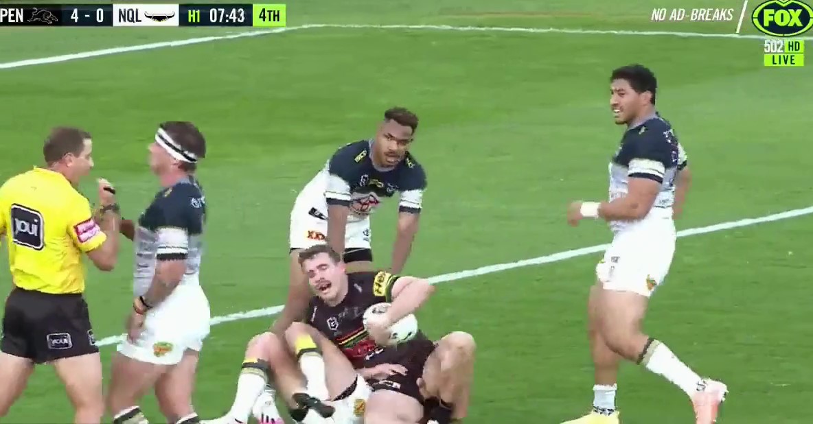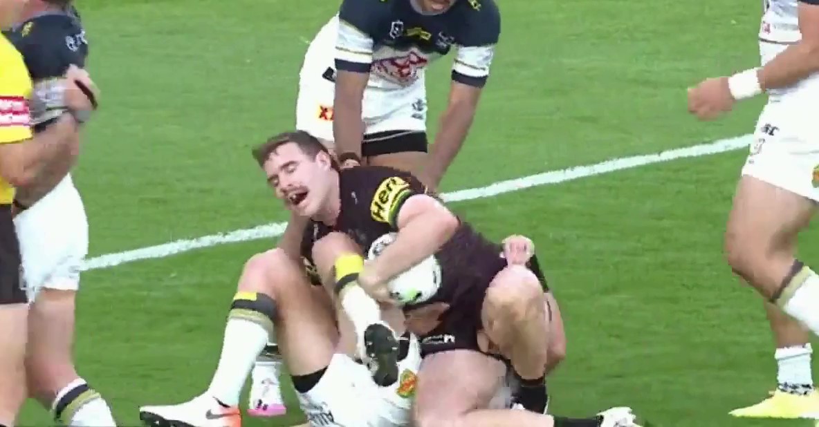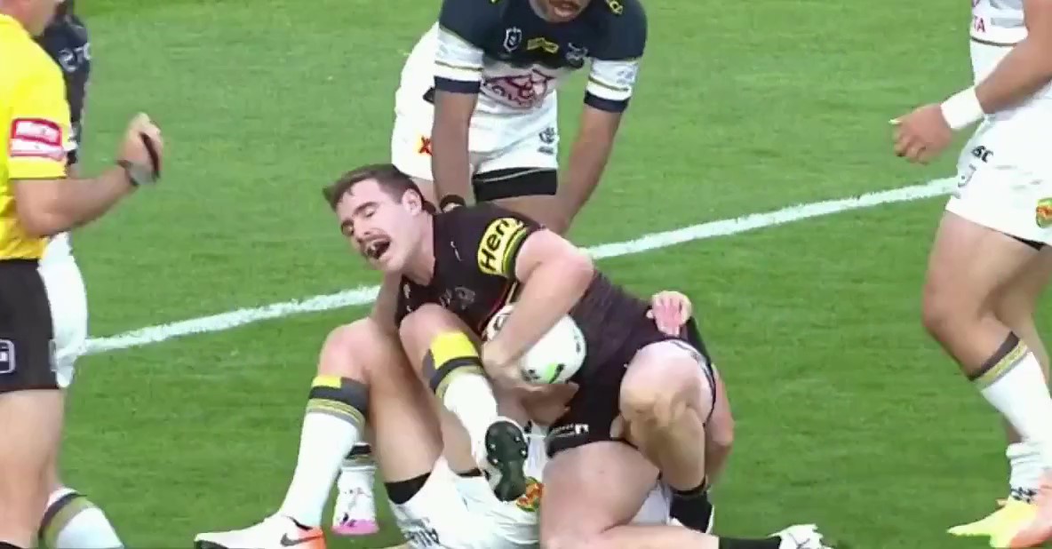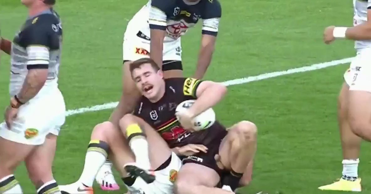 Billy Burns accidentally showed off his penis after being tackled on live TV. Burns was wrestled to the floor by Coen Hess in a big tackle as he attempted to snatch a crucial try