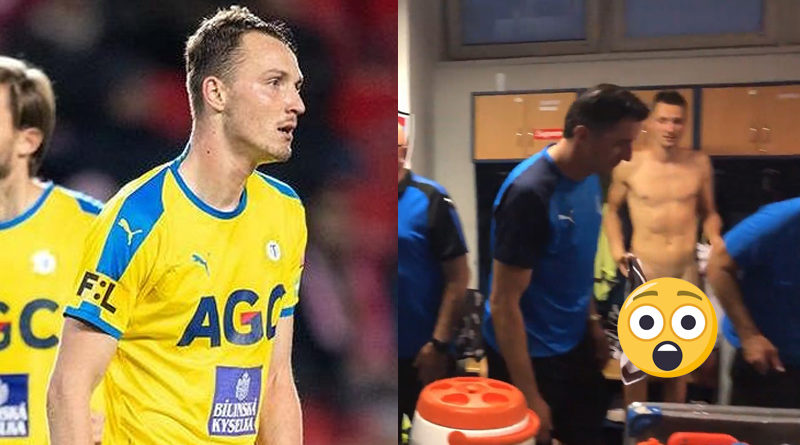 Michal Jerabek is a cute Czech footballer playing for FK Teplice. He has been caught showing in his long uncut cock while accidentally towelling off during a locker room interview.