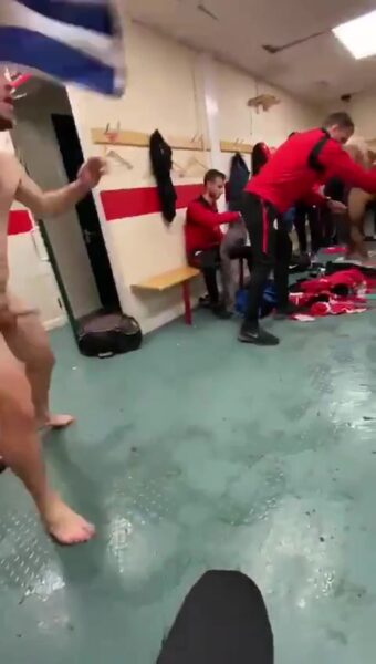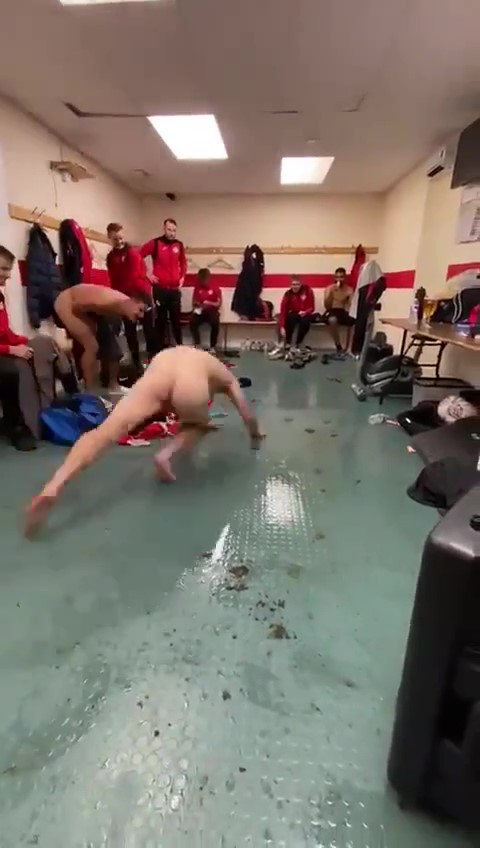 Footballers love to celebrate naked in the locker room! They have no problem with it! Watch this crazy guy celebrating with a naked slide in the locker room. Nice bouncing cock!
