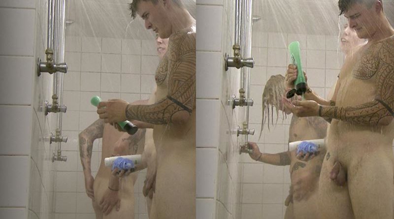 This handsome tattooed footballer must work up quite a sweat in the crotch area while playing their match because he goes straight in to soap up his dick and under his balls! It’s probably why he also keeps his pubes shaved unlike his buddies who surround him in the showers with their full fleecy bushes.