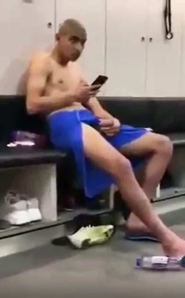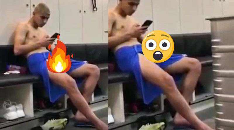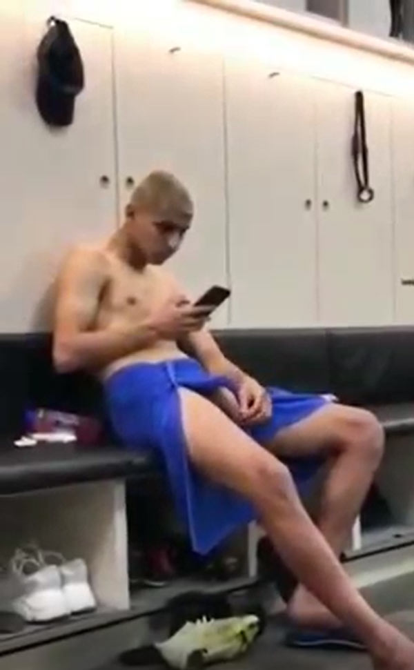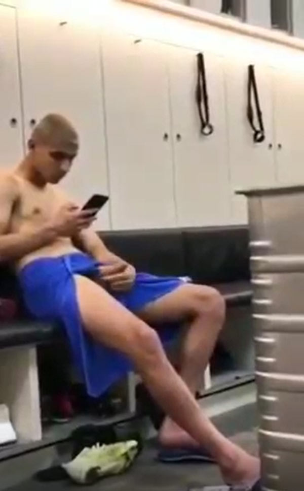 This soccer player wants to relieve the tension of an overworked game and once left alone in the locker room takes the opportunity to jerk off. He sits on the bench and pulls his BIG cock out of the towel and of course he gets caught by a teammate!!