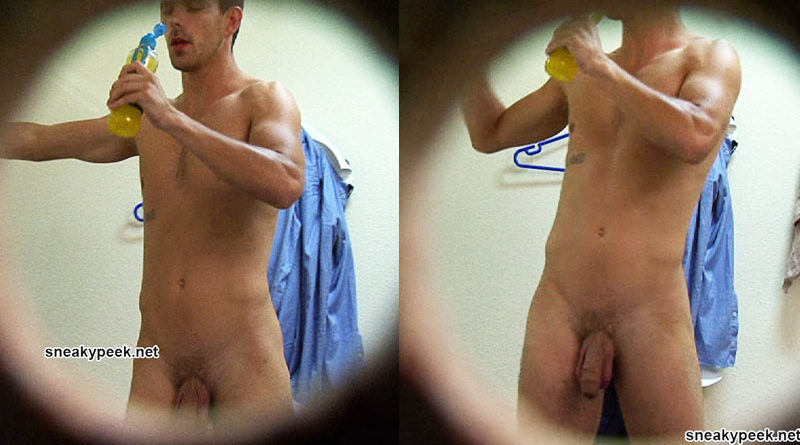 My tiny camera points through a miniscule hole in this changing room wall and I’ve managed to capture incredible footage of this handsome young footballer showing off his body. He doesn’t know that I’m filming him and I record this horny video of his arse and then a quick glimpse of his dick as well. This guy is very, very hot – I’d really like to be in that room with him!