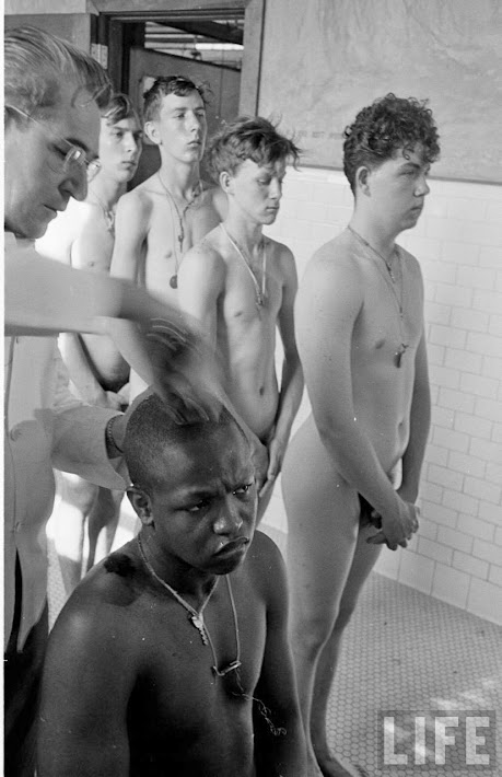 In these photos from the Life archive from 1951 we can see a group of recruits at the Marine Boot Camp undressing, soldiers inspecting and spraying genitals, and showering after haircuts